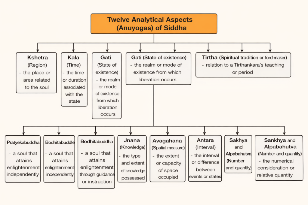 The liberated souls can be differentiated with reference to the region – ksetra, time – kāla, state – gati, sign – lińga, the Tīrthańkara – tīrtha, conduct – cāritra, self- enlightened – pratyekabuddha, enlightened by others – bodhitabuddha, knowledge – jñāna, stature – avagāhanā, interval – antara, number – samkhyā, and numerical comparison – alpabahutva.