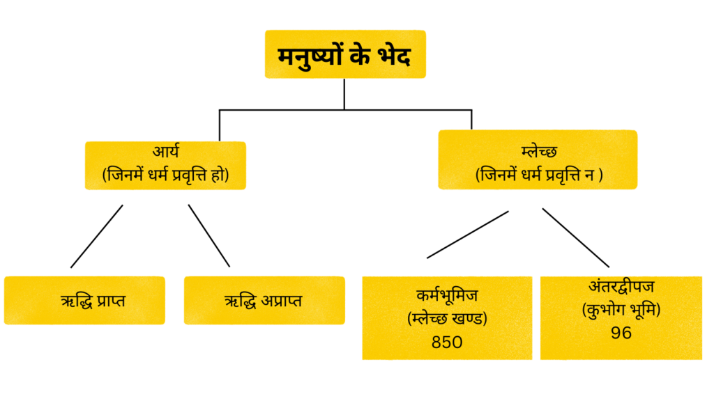 मनुष्य के दो भेद हैं- आर्य और म्लेच्छ । आर्य- जो अनेक गुणों से सम्पन्न होता है तथा गुणी पुरुष जिसकी सेवा करते हैं उसे आर्य कहते हैं। म्लेच्छ – जो आचार विचार से भ्रष्ट होता है तथा जिसे कर्म का कुछ विवेक नहीं होता उसे म्लेच्छ कहते हैं। आर्यों के मुख्य दो भेद हैं – ऋद्धि प्राप्त आर्य और ऋद्धि रहित आर्य | जिनके तप आदि से बुद्धि आदिक ऋद्धियाँ उत्पन्न हो जाती हैं वे ऋद्धि प्राप्त आर्य हैं। ऋद्धि रहित आर्य निमित्त भेद से पाँच प्रकार के बतलाये हैं क्षेत्रार्य, जात्यार्य, चारित्रार्य, कर्मार्य और दर्शनार्य । म्लेच्छ मुख्यता धर्म-कर्म व्यवस्था से रहित होते हैं, इसी से ये म्लेच्छ कहलाते हैं। ये अन्तर्द्धपज और कर्मभूमिज – इस प्रकार दो तरह के होते हैं। लवणसमुद्र और कालोदसमुद्र के मध्य में स्थित अन्तद्वीपों में निवास करने वाले कुभोगभूमिज मनुष्य अन्तद्वपज म्लेच्छ हैं तथा कर्मभूमि में पैदा हुए आर्यसंस्कृति से हीन मनुष्य कर्मभूमिज म्लेच्छ हैं। Reference:Tatvartha-Sutra-Pradeep-Bhaiya-Piyush-तत्वार्थसूत्र बा.ब्र.प्रदीप पियूष– Link to book
