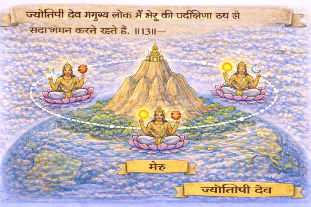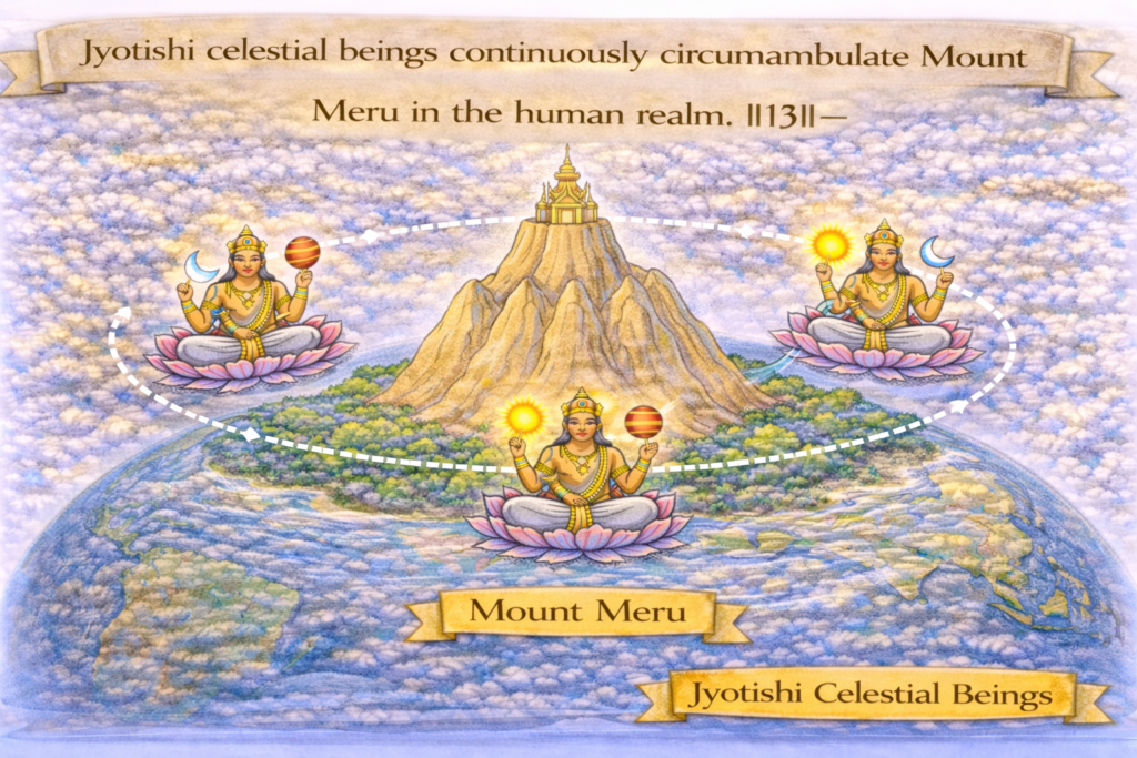The luminary deva (jyotisī deva) of the human region (manusyaloka, nrloka), move incessantly round Mount Meru, from left to right – merupradaksinā.