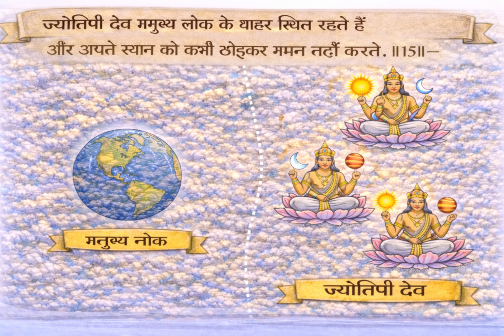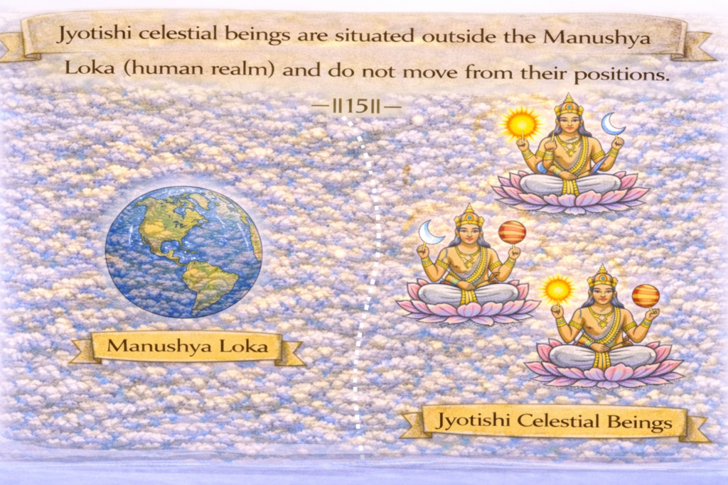 अर्थ: मनुष्य लोक के बाहर ज्योतिषी देव अवस्थित हैं – गमन नहीं करते हैं।