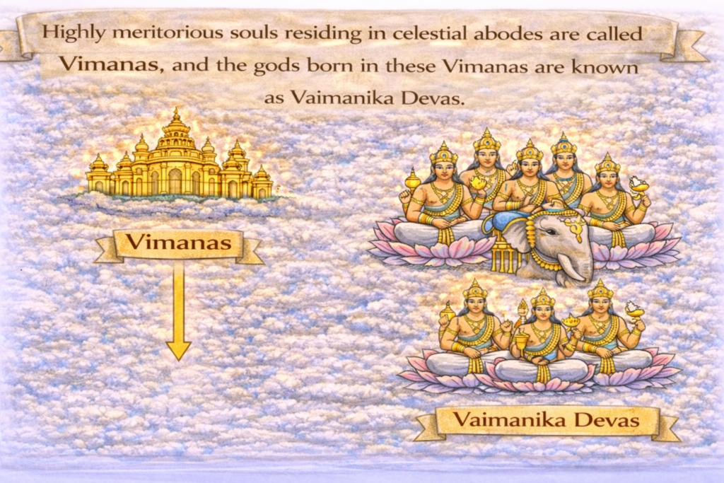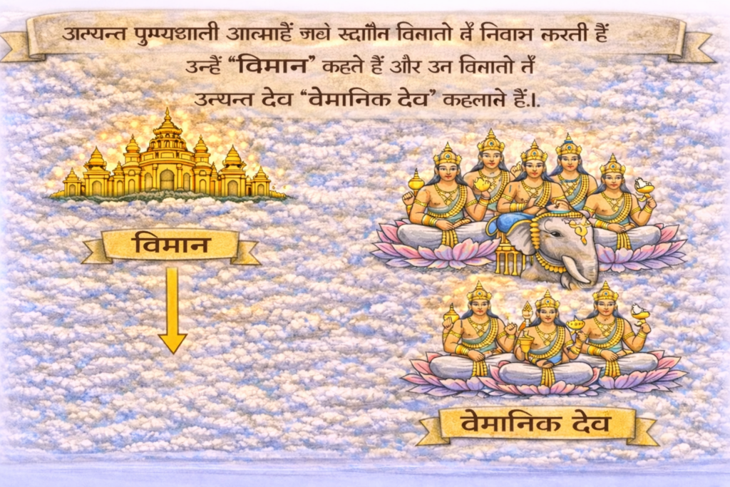 अर्थ: जिनमें रहने वाले जीव विशेष रूप से पुण्यशाली माने जाते हैं उन्हें विमान कहते हैं और विमानों में जो देव उत्पन्न होते हैं उन्हें वैमानिक कहते हैं।