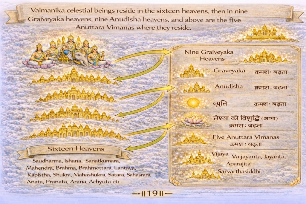 The heavenly deva (vaimānika) reside in kalpa called Saudharma, Aiśāna, Sānatkumāra, Māhendra, Brahma, Brahmottara, Lāntava, Kāpistha, Śukra, Mahāśukra, Śatāra, Sahasrāra, in Ānata-Prānata, Ārana-Acyuta, in nine graiveyaka, and in Vijaya, Vaijayanta, Jayanta, Aparājita and Sarvārthasiddhi also.