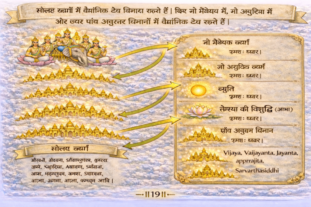 अर्थ: सौधर्म, ईशान, सानत्कुमार, माहेन्द्र, ब्रह्म, ब्रह्मोत्तर, लान्तव, कापिष्ठ, शुक्र, महाशुक्र, शतार, सहस्रार, आनत, प्राणत, आरण, अच्युत — इन सोलह स्वर्गों में, इनके ऊपर नौ ग्रैवेयक में, नौ अनुदिशों में और विजय, वैजयन्त, जयन्त, अपराजित और सर्वार्थसिद्धि इन पाँच अनुत्तर विमानों में वैमानिक देव रहते हैं।