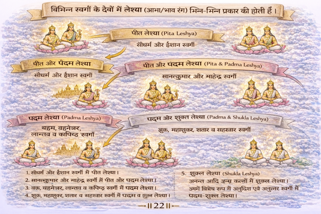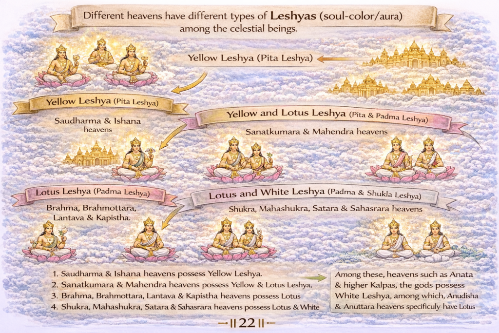 अर्थ: सौधर्म और ईशान स्वर्ग के देवों में पीत लेश्या है। सानत्कुमार और माहेन्द्र स्वर्ग के देवों में पीत और पद्म लेश्या है। ब्रह्म, ब्रह्मोत्तर, लान्तव और कापिष्ठ स्वर्ग में पद्म लेश्या है। शुक्र, महाशुक्र, शतार और सहस्रार में पद्म और शुक्ल लेश्या है। शेष आनत आदि कल्पों में शुक्ल लेश्या है। उनमें भी अनुदिश और अनुत्तरों में पद्म शुक्ल लेश्या है ॥२२॥
