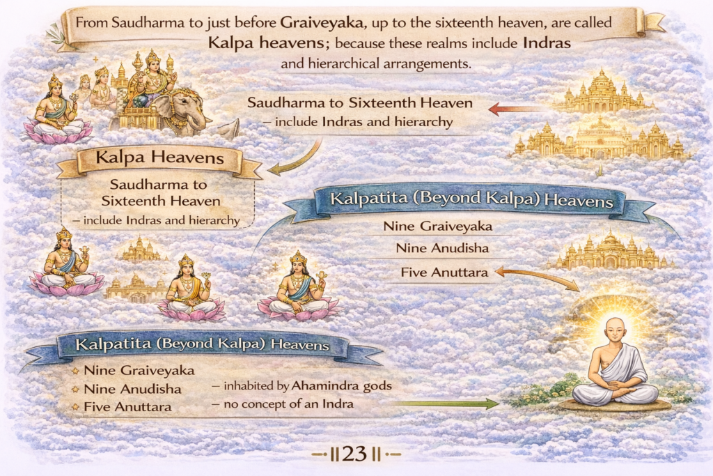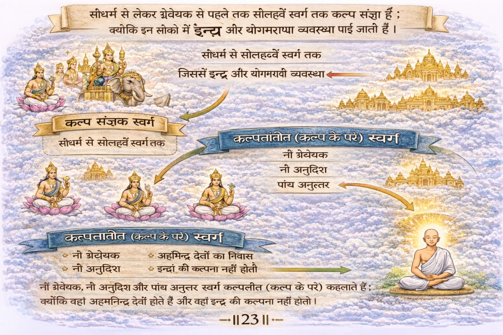 अर्थ: सौधर्म से लेकर ग्रैवेयक से पहले अर्थात् सोलहवें स्वर्ग तक कल्प संज्ञा हैं; क्योंकि जिनमें इन्द्र वगैरह की कल्पना पाई जाती है उन्हें ही कल्प संज्ञा है। अतः नौ ग्रैवेयक, नौ अनुदिश और पाँच अनुत्तर कल्पातीत हैं; क्योंकि अहमनिन्द्र होने से उनमें इन्द्र आदि की कल्पना नहीं होती ॥२३॥
