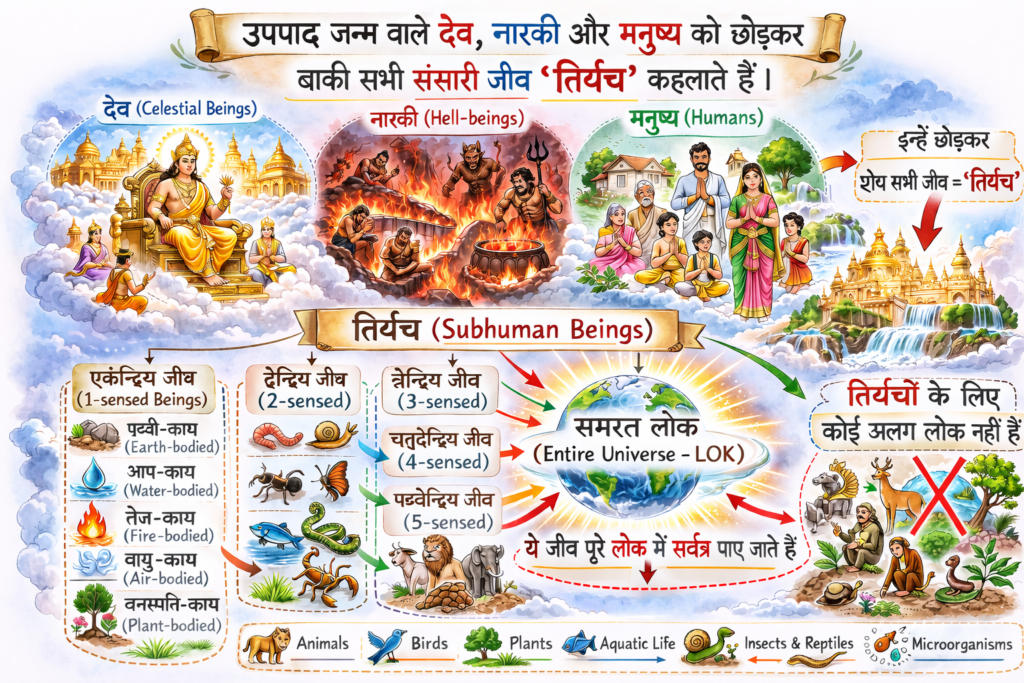 अर्थ: उपपाद जन्म वाले देव नारकी और मनुष्यों के सिवाय बाकी जो संसारी जीव हैं वे सब तिर्यंच हैं। अतः एकेन्द्रिय जीव भी तिर्यंच ही हैं। वे समस्त लोक में पाए जाते हैं। इसी से तिर्यंचों का कोई अलग लोक नहीं बताया है ।।२७।।