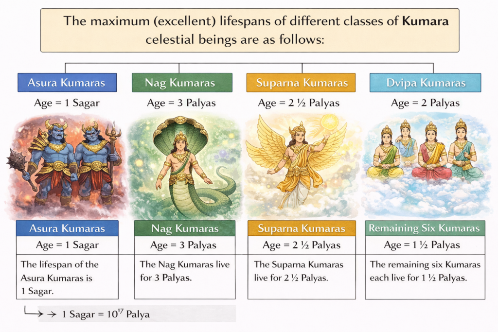 अर्थ: असुर कुमारों की आयु एक सागर है। नाग कुमारों की तीन पल्य है। सुपर्ण कुमारों की आयु अढाई पल्य है। द्वीप कुमारों की आयु दो पल्य है और बाकी के छः कुमारों की आयु डेढ़-डेढ़ पल्य है। यह इनकी उत्कृष्ट आयु है ।।२८।।