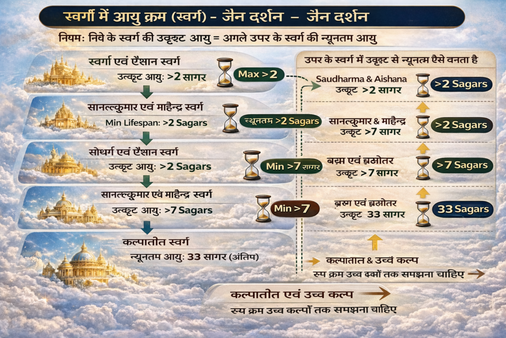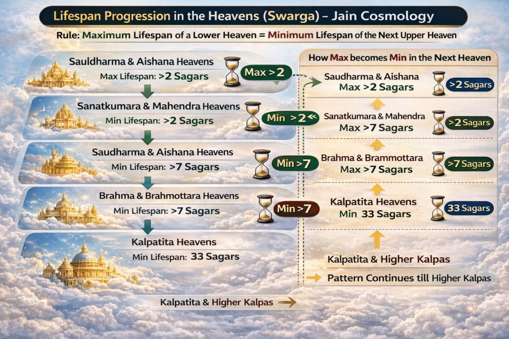अर्थ: नीचे-नीचे के स्वर्गों में जो उत्कृष्ट आयु है वही उसके ऊपर के स्वर्गों में जघन्य आयु है। अर्थात् सौधर्म–ऐशान में जो दो सागर से अधिक आयु है वह सानत्कुमार और माहेन्द्र स्वर्ग में जघन्य आयु है। सानत्कुमार–माहेन्द्र में जो सात सागर से अधिक उत्कृष्ट आयु है वही ब्रह्म–ब्रह्मोत्तर में जघन्य है। इसी तरह ऊपर के समस्त कल्पों में और कल्पातीतों में जानना चाहिए ।।३४।।