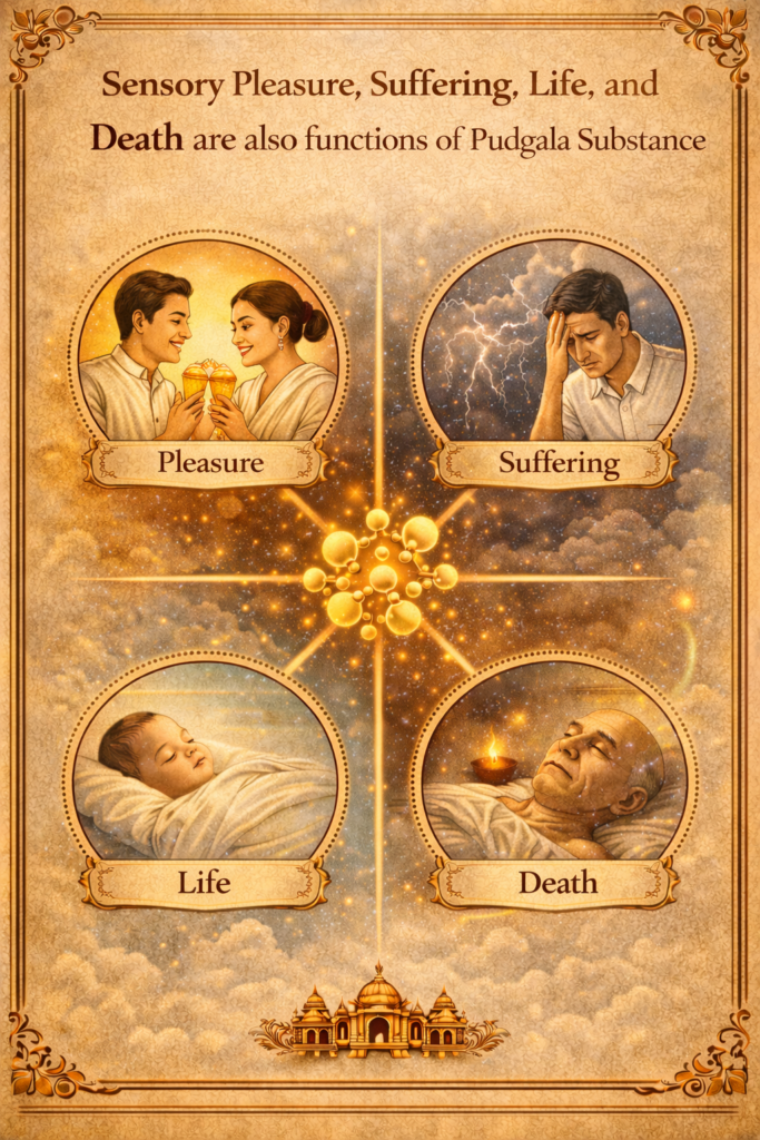 The function of the matter (pudgala) is also to contribute to pleasure (sukha), suffering (duhkha), living (jīvita), and death (marana) of living beings (jīva). Reference:Tatvartha-Sutra-तत्वार्थ-सूत्र-Vijay-K-Jain