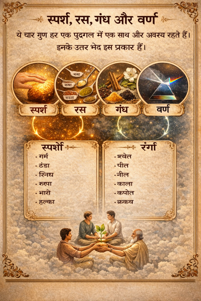 स्पर्श, रस, गंध और वर्ण ये चार गुण हर एक पुद्गल में एक साथ और अवश्य रहते हैं। इनके उत्तर भेद इस प्रकार हैं। Reference:Tatvartha-Sutra-Pradeep-Bhaiya-Piyush-तत्वार्थसूत्र बा.ब्र.प्रदीप पियूषLink to book