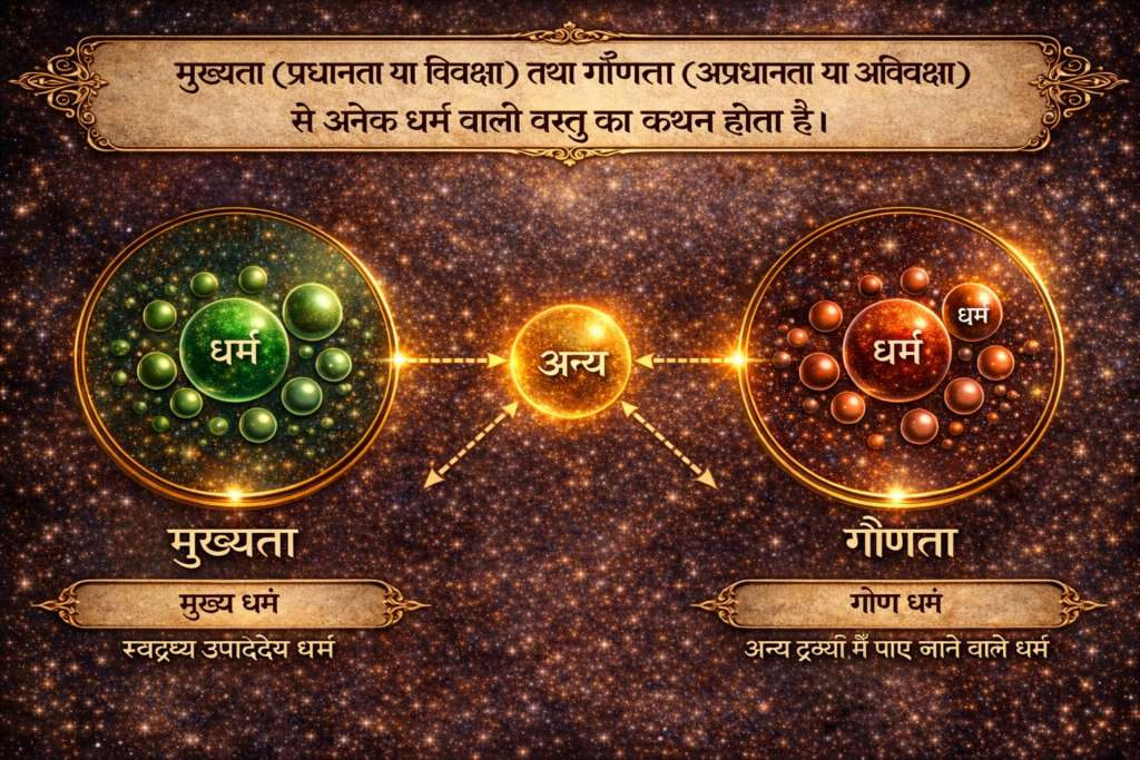 Answer अर्पित (विवक्षा) एवं अनर्पित (अविवक्षा) की अपेक्षा एक ही पदार्थ में दोनों धर्मों की सिद्धि होती है।