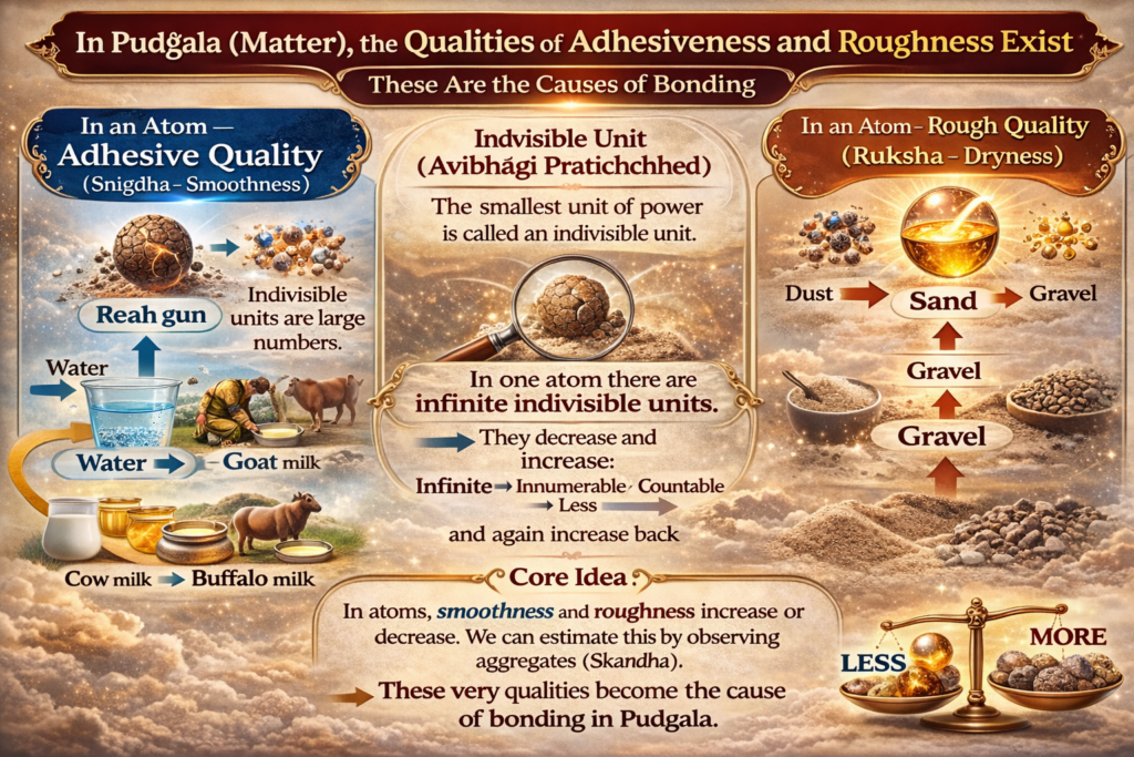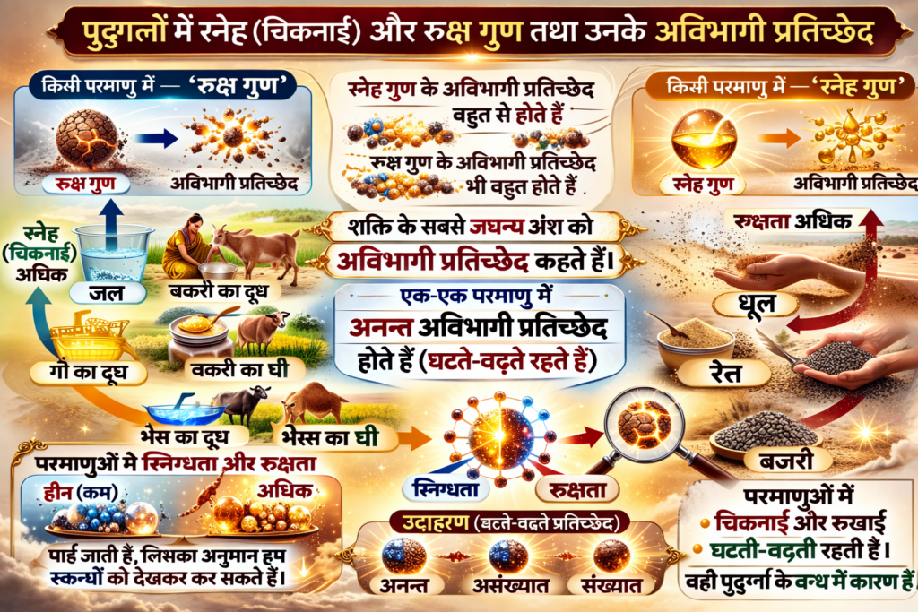 पुद्गलों में स्नेह और रूक्ष गुण पाए जाते हैं । किन्हीं परमाणुओं में रूक्ष गुण होता है और किन्हीं परमाणुओं में स्नेह गुण होता है। स्नेह गुण के अविभागी प्रतिच्छेद बहुत से होते हैं। इसी तरह रूक्ष गुण के अविभागी प्रतिच्छेद भी बहुत होते हैं। शक्ति के सबसे जघन्य अंश को अविभागी प्रतिच्छेद कहते हैं। एक-एक परमाणु में अनन्त अविभागी प्रतिच्छेद होते हैं और वे घटते बढ़ते रहते हैं। किसी समय अनन्त अविभागी प्रतिच्छेद से घटते घटते असंख्यात अथवा संख्यात अथवा और भी कम अविभागी प्रतिच्छेद रह जाते हैं। और कभी बढ़कर, संख्यात, असंख्यात अथवा अनन्त अविभागी प्रतिच्छेद हो जाते हैं। इस तरह परमाणुओं में स्निग्धता और रूक्षता हीन या अधिक पाई जाती है जिसका अनुमान हम स्कन्धों को देखकर कर सकते हैं। जैसे जल से बकरी के दूध घी में, बकरी के दूध घी से गौ के दूध घी में, गौ के दूध घी से भैंस दूध घी में और भैंस के दूध घी से ऊँटनी के दूध घी में चिकनाई अधिक पाई जाती है। इसी तरह धूल से रेत में और रेत से बजरी में रूखापन अधिक पाया जाता है। वैसे ही परमाणुओं में भी चिकनाई और रुखाई कमती बढ़ती होती है। वही पुद्गलों के बंध में कारण हैं ॥ ३३ ॥