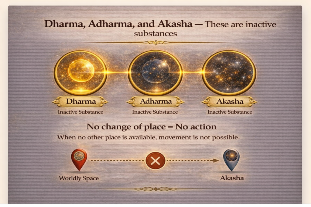 These three [the medium of motion (dharma), themedium of rest (adharma) and the space (ākāśa ) ] are also without-movement ( niskriya). Reference:Tatvartha-Sutra-तत्वार्थ-सूत्र-Vijay-K-Jain