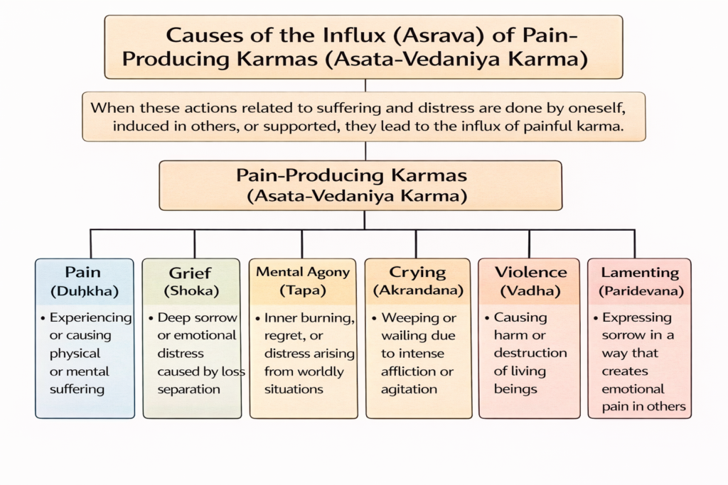 Suffering (duhkha), sorrow (śoka), agony (tāpa), moaning (ākrandana), injury (vadha) and lamentation (parivedana), in oneself, in others, or in both, lead to the influx (āsrava) of karmas that cause unpleasant-feeling (asātā vedanīya).
