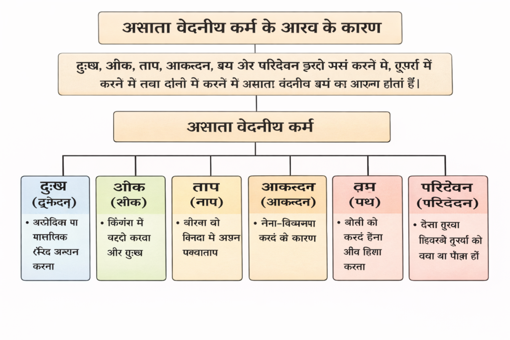 अर्थ: दुःख, शोक, ताप, आक्रन्दन, वध और परिदेवन इन्हें स्वयं करने से, दूसरों में करने से तथा दोनों में करने से असाता वेदनीय कर्म का आस्रव होता है।