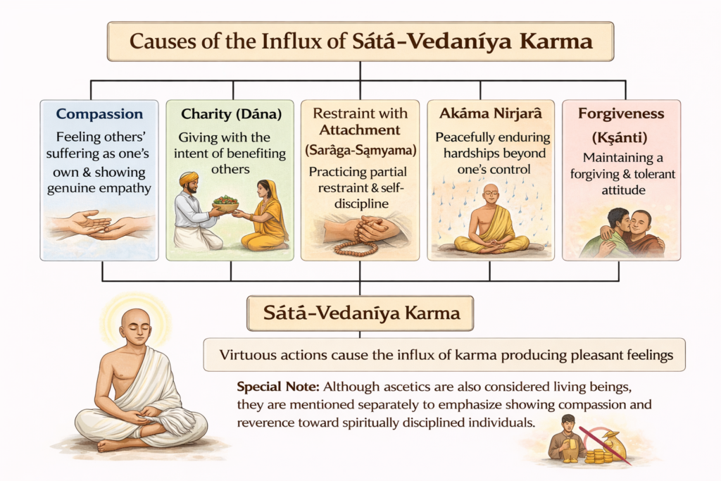 Compassion (anukampā) towards the living-beings (bhūta) in general and the devout (vratī) in particular, charity (dāna), restraint-with-attachment (sarāgasamyama), etc., contemplation on the aforementioned, equanimity (ksānti), and purity (śauca) – freedom-from-greed – lead to the influx (āsrava) of karmas that cause pleasant-feeling (sātā vedanīya).