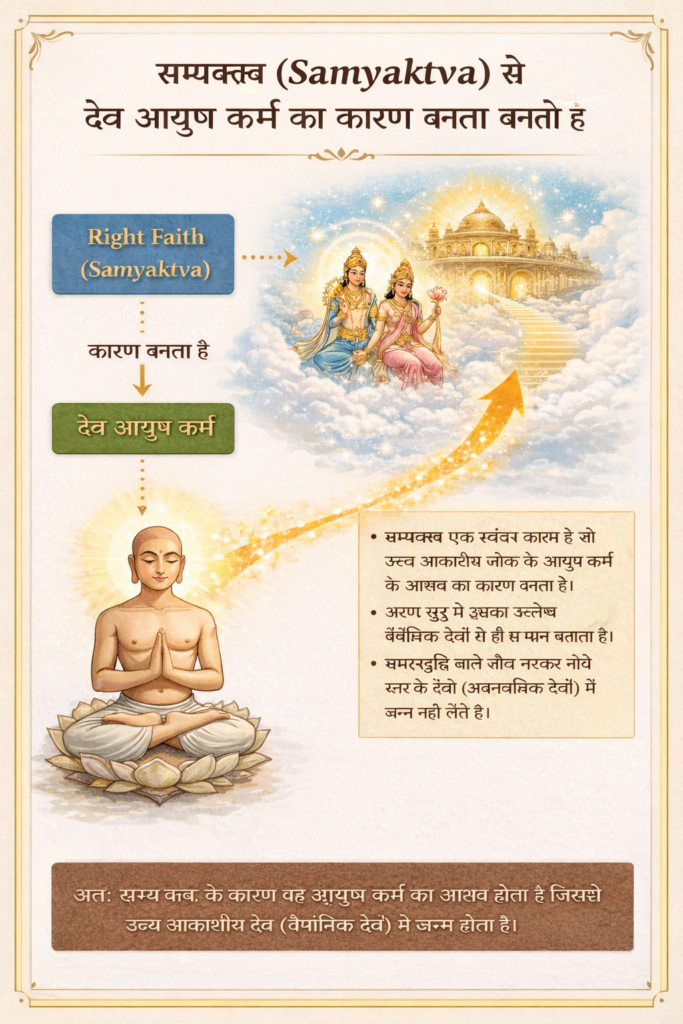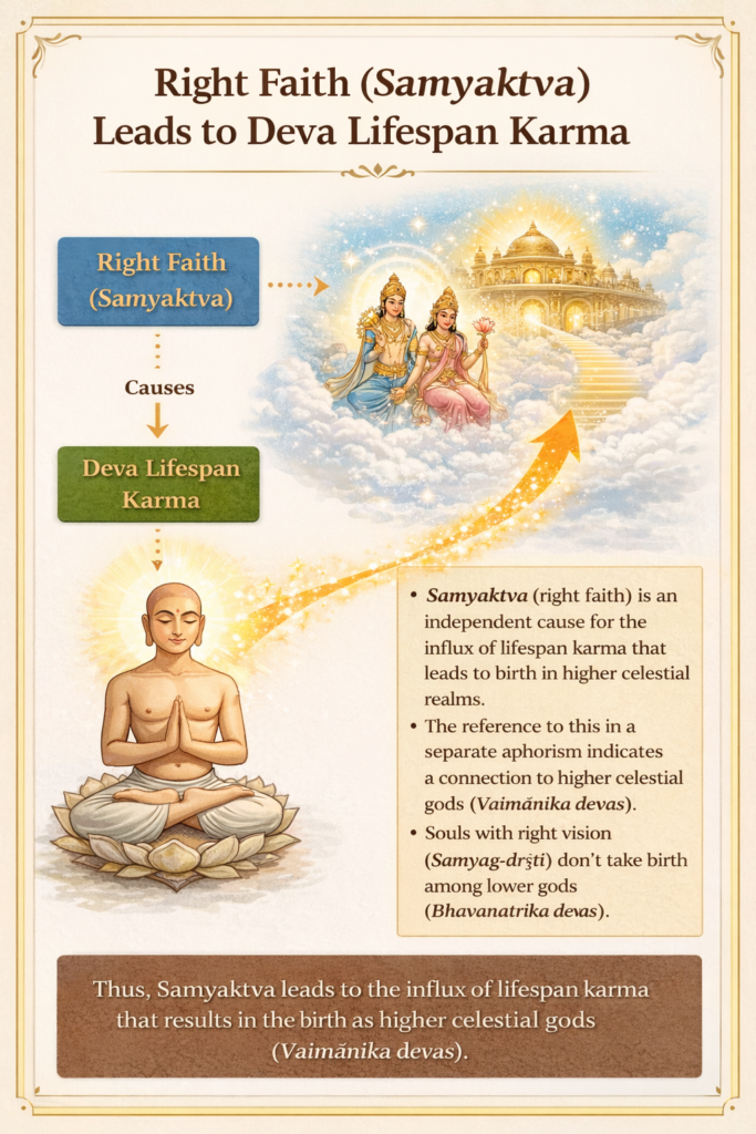 Right belief (samyaktva) also causes the influx (āsrava) of life-karma (āyuh) leading to celestial-birth (deva).