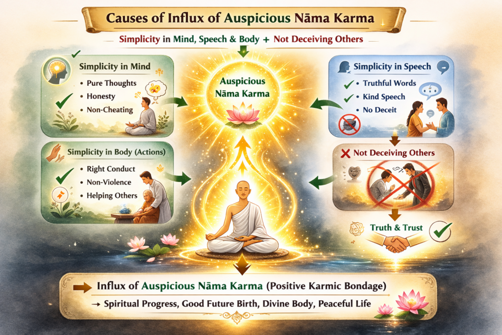 The opposites of these, namely, straightforward activity and honesty or candour, cause the influx of auspicious (śubha) physique-making (nāma) karmas.