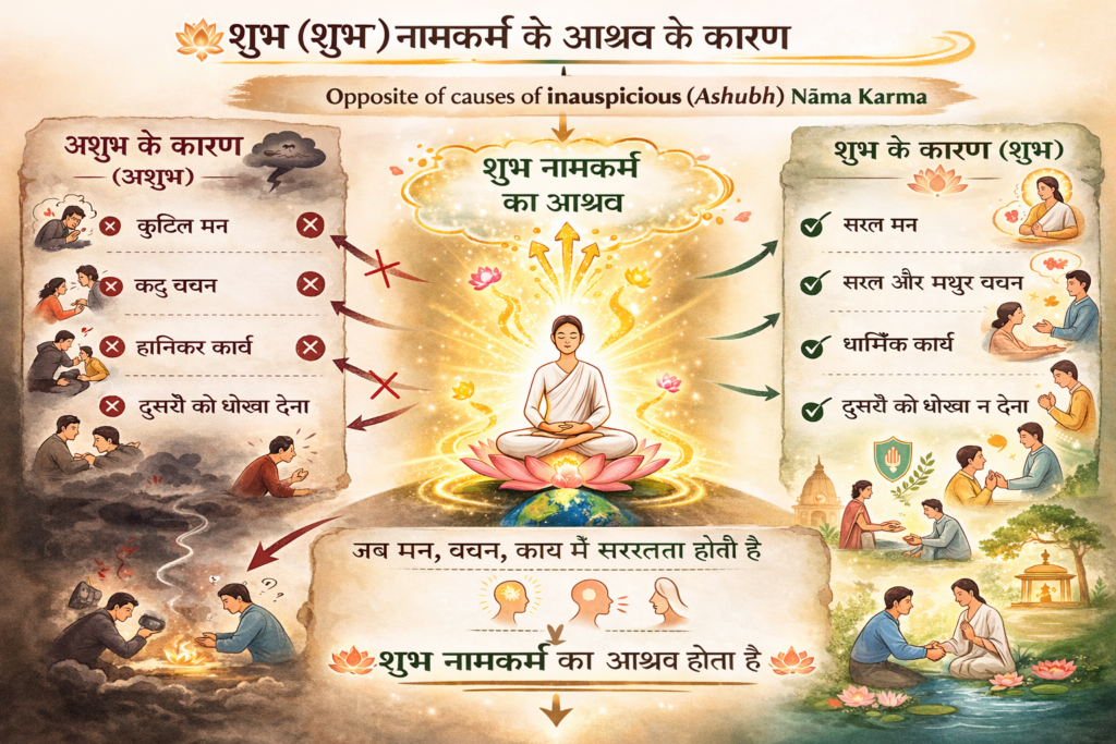 समाधान: (१) मन, वचन, काय की सरलता, अविसंवादन, धर्मात्मा पुरुषों का दर्शन करना। (२) आदर-सत्कार करना, उनके प्रति सद्भाव रखना, संसार से भयभीत रहना। (३) प्रमाद का त्याग करना, निश्छल चारित्र का पालन करना। (४) पूर्व में कहे गये अशुभ नाम कर्म के आश्रव के कारणों से विपरीत परिणाम शुभ नाम कर्म के आश्रव के कारण हैं।