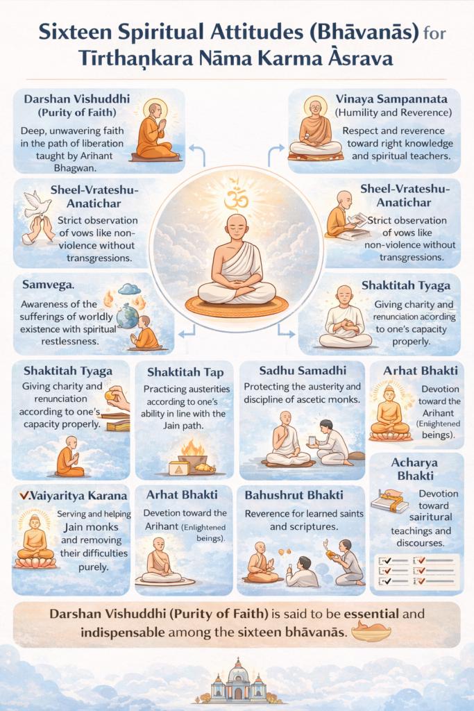 The influx (āsrava) of the Tīrthańkara name-karma (nāmakarma) is caused by these sixteen: purity of right faith – darśanaviśuddhi, reverence – vinayasampannatā, observance of vows and supplementary vows without transgression – śīlavratānaticāra, ceaseless pursuit of knowledge – abhīksna jñānopayoga, perpetual fear of the cycle of existence – samvega, giving gifts (charity) – tyāga, practising austerities according to one’s capacity – tapa, removal of obstacles that threaten the equanimity of ascetics – sādhusamādhi, serving the meritorious by warding off evil or suffering – vaiyāvrttya, devotion to the Omniscient Lord – arhatbhakti, devotion to the chief preceptors – ācāryabhakti, devotion to the preceptors – bahuśrutabhakti, devotion to the Scripture – pravacanabhakti, practice of the six essential daily duties – āvaśyakāparihāni, propagation of the teachings of the Omniscient Lord – prabhāvanā, and fervent affection for one’s brethren following the same path – pravacanavatsalatva.