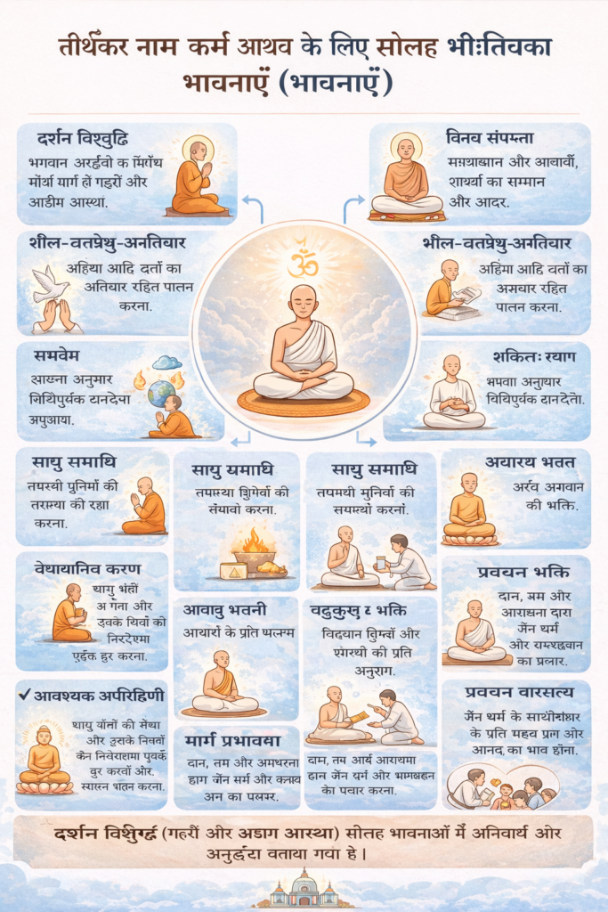 | १ | दर्शन विशुद्धि | अर्हंत द्वारा कहे गए मोक्षमार्ग में रुचि |