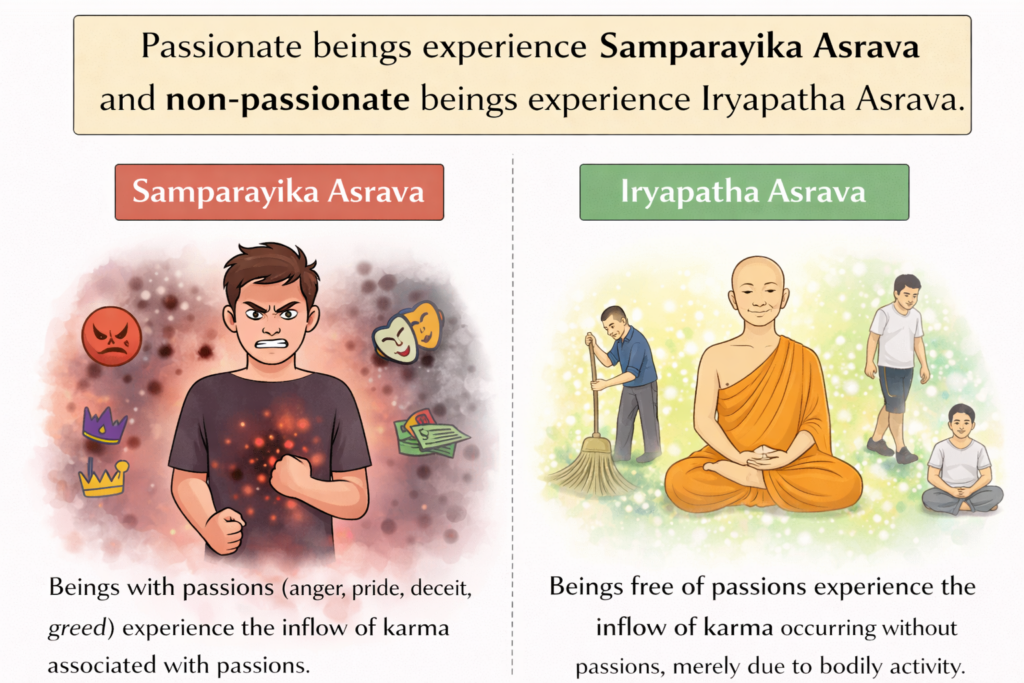 Activity (yoga) with-passions (sakasāya) and without- passions (akasāya) causes influx (āsrava) of karmas, those that extend transmigration – sāmparāyika – and those that shorten transmigration – īryāpatha, respectively.