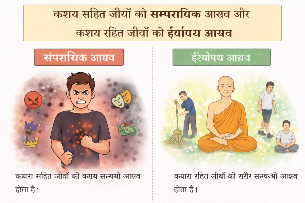 अर्थ: कषाय सहित जीवों के साम्परायिक आस्रव होता है और कषाय रहित जीवों के ईर्यापथ आस्रव होता है।