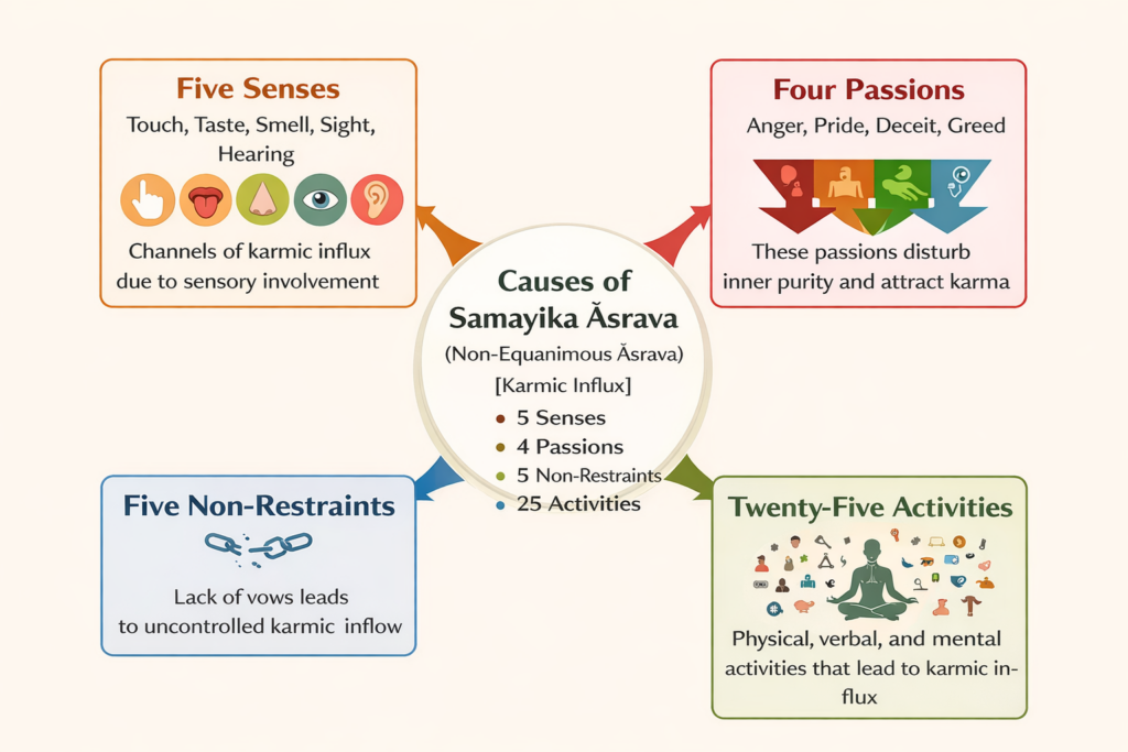The subdivisions of the former – influx (āsrava) of ‘sāmparāyika’ karmas – are the senses (indriya), the passions (kasāya), the vowlessness (avrata) and the activities (kriyā), of five, four, five, and twenty-five kinds, respectively.