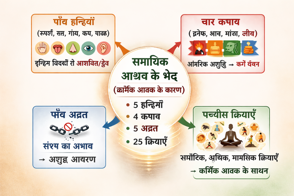 अर्थ: इन्द्रिय पाँच, कषाय चार, अव्रत पाँच, क्रिया पच्चीस, ये सब सामायिक आश्रव के भेद हैं।