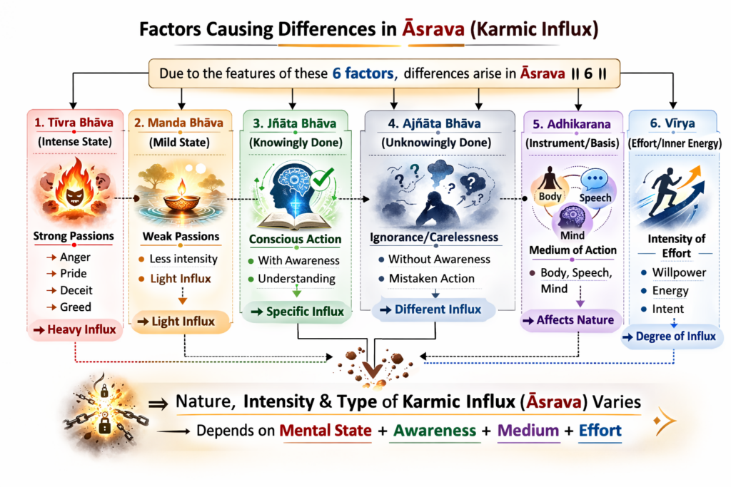 Influx (āsrava) is differentiated on the basis of intenseness (tīvra) or mildness (manda) of disposition (bhāva), intentional (jñāta) or unintentional (ajñāta) nature of disposition (bhāva), the substratum (adhikarana), and distinct-potency (vīryaviśesa) of disposition (bhāva).