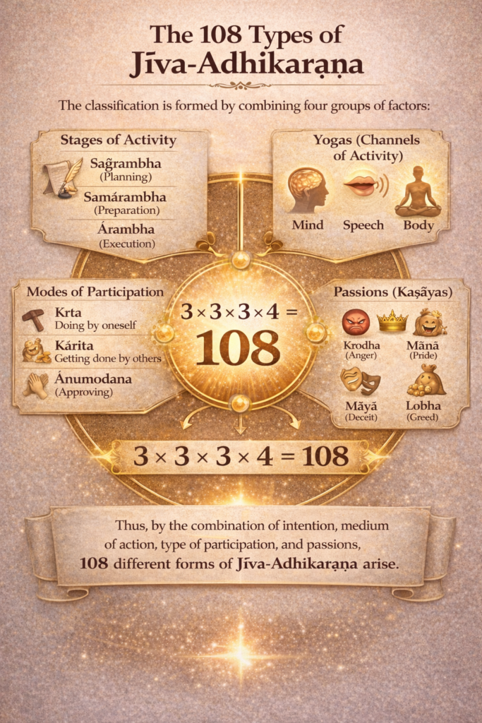 The first, living-substratum (jīvādhikarana) of influx (āsrava), is of three kinds in terms of planning (samrambha), preparation (samārambha) and commencement (ārambha); of three kinds in terms of (three kinds of) ‘yoga’; of three kinds in terms of doing (krta), causing it done (kārita) and approval (anumata); of four kinds in terms of (four kinds of) passions (kasāya). All these, with their combinations, are of one hundred and eight kinds.