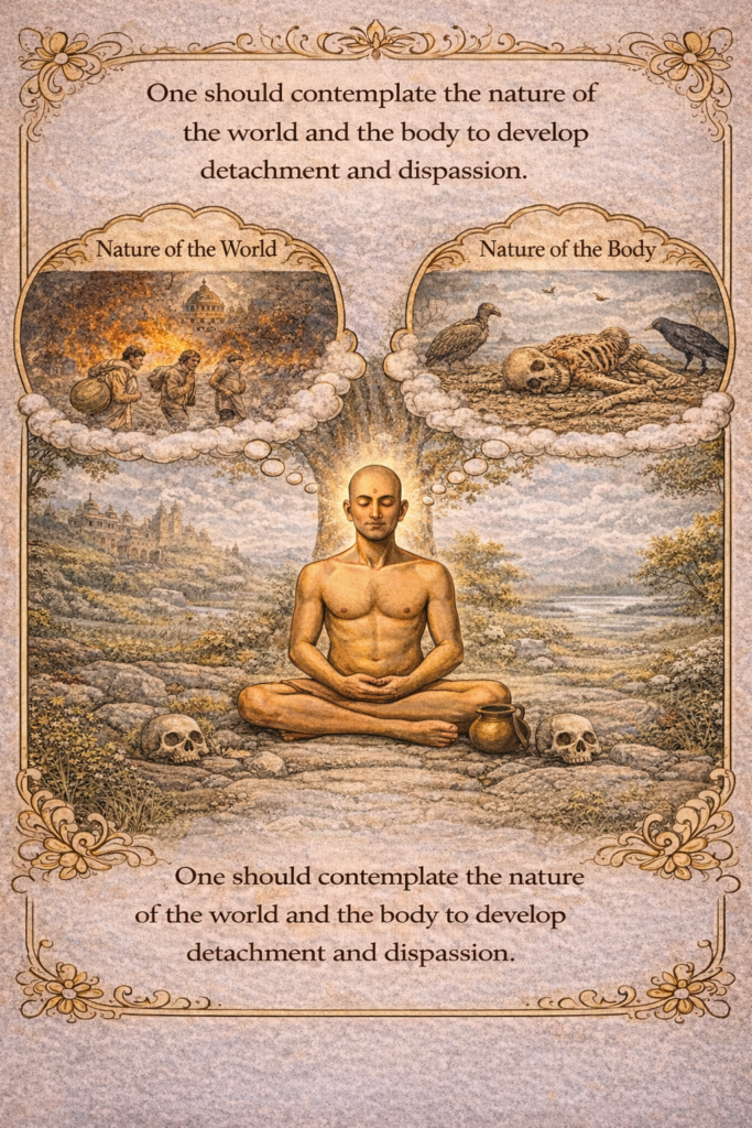 existence – samvega – and detachment to worldly objects – vairāgya – the nature of the universe – jagatsvabhāva – and the nature of the body – kāyasvabhāva – should also be contemplated. Reference:Tatvartha-Sutra-तत्वार्थ-सूत्र-Vijay-K-Jain
