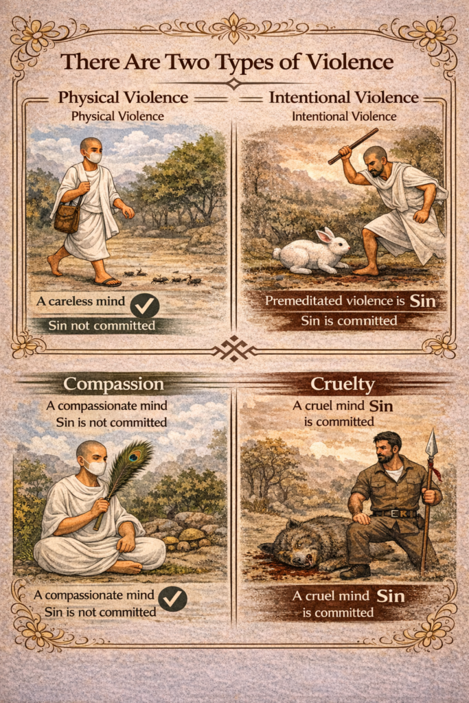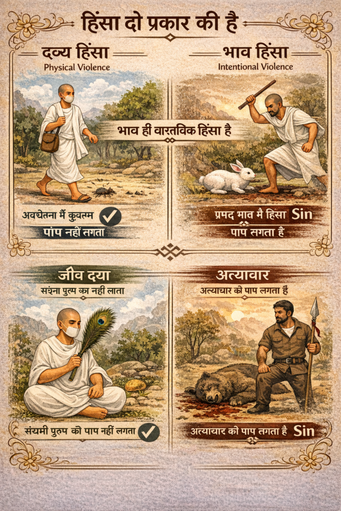 हिंसा दो प्रकार की है- एक द्रव्य हिंसा, दूसरी भाव हिंसा । संसार में सर्वत्र जीव पाए जाते हैं और वे अपने निमित्त से मरते भी हैं। किंतु उनके मर जाने से ही हिंसा नहीं हो जाती । इसी से सूत्र में ‘प्रमत्त योगात्’ पद दिया है। यह बतलाता है। कि जो मनुष्य जीवों की हिंसा करने के भाव नहीं रखता, बल्कि उनको बचाने के भाव रखता है, उसके द्वारा जो हिंसा होती है उसका पाप उसे नहीं लगता। इसी से कहा है कि ‘प्राणों का घात कर देने पर भी हिंसा का पाप नहीं लगता’ । शास्त्रकारों ने इस बात को एक दृष्टांत के द्वारा और भी स्पष्ट किया है। वे लिखते हैं- ‘एक मनुष्य देख देख कर चल रहा है। उसके पैर उठाने पर कोई क्षुद्र जन्तु उसके पैर के नीचे अचानक आ जाता है और कुचलकर मर जाता है तो उस मनुष्य को उस जीव के मारने का थोड़ा सा भी पाप नहीं लगता।’ इसके विपरीत यदि कोई असावधानी से मार्ग में चलता है तो उसके द्वारा किसी जीव का घात हो या न हो, उसे हिंसा का पाप अवश्य लगता है। जैसा कि कहा है- ‘जीव जिये या मरे जो अत्याचारी है उसे हिंसा का पाप अवश्य • लगता है। किंतु जो यत्नाचार से काम करता है उसे हिंसा होने पर भी हिंसा का पाप नहीं लगता।’ अतः हिंसा रूप परिणाम ही वास्तव में हिंसा है। द्रव्य हिंसा को तो केवल इसलिए हिंसा कहा है कि उसका भाव हिंसा के साथ संबंध है। किंतु द्रव्य हिंसा के होने पर भाव हिंसा का होना अनिवार्य नहीं है। जैनेतर धर्मों में द्रव्य हिंसा और भाव हिंसा को अलग-अलग न मानने से ही निम्न शंका की गई है कि जल में जंतु हैं, थल में जंतु हैं और पहाड़ की चोटी पर चले जाओ तो वहाँ भी जंतु हैं। इस तरह जब समस्त लोक जन्तुओं से भरा हुआ है तो कोई अहिंसक कैसे हो सकता है।’ जैन धर्म में इसका उत्तर इस प्रकार दिया गया है- ‘जीव दो प्रकार के होते हैं, और स्थूल सूक्ष्म तो न किसी से रुकते हैं और न किसी को रोकते हैं अतः उनका तो कोई प्रश्न ही नहीं । सूक्ष्म रहे स्थूल, सो जिनकी रक्षा करना संभव है उनकी रक्षा की जाती है। अतः संयमी पुरुष को हिंसा का पाप कैसे लग सकता है ‘ ॥ १३ ॥ Reference:TatvarthaSutra_KailashChand_Shastri_तत्वार्थसूत्र पंडित कैलाशचंद्र शास्त्री