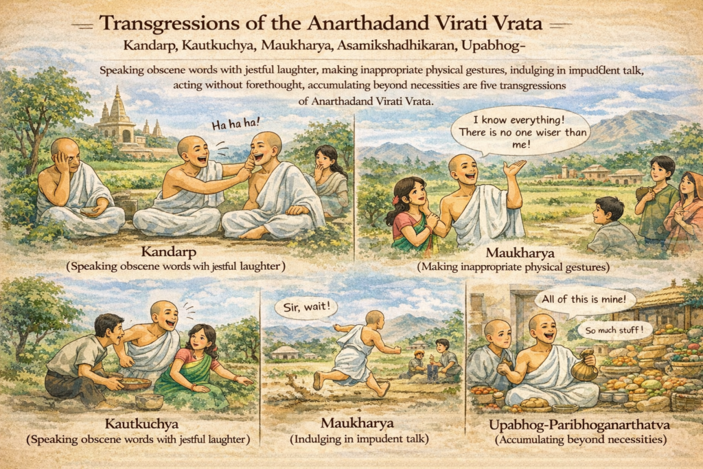 Vulgar jokes – kandarpa, vulgar jokes accompanied by gesticulation – kautkucya, garrulity – maukharya, unthinkingly indulging in too much action – asamīkṣyā- dhikarana, and keeping too many consumables and non- consumables – upabhogaparibhogānarthakya, are the five transgressions of the supplementary vow of withdrawing from purposeless sin – anarthadaṇḍavirativrata. Reference:Tatvartha-Sutra-तत्वार्थ-सूत्र-Vijay-K-Jain