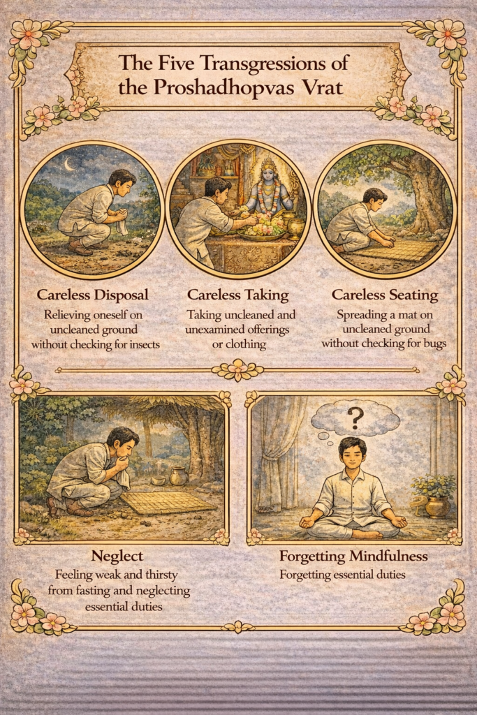 Performing these three activities, excreting – utsarga, taking of objects – ādāna, and spreading mats and garments – samstara, without inspecting and cleaning the place and the materials, lack of earnestness – anādara, and lack of concentration – smṛtyanupasthāna, are the five transgressions of the supplementary vow of fasting at regular intervals – proṣadhopavāsavrata.