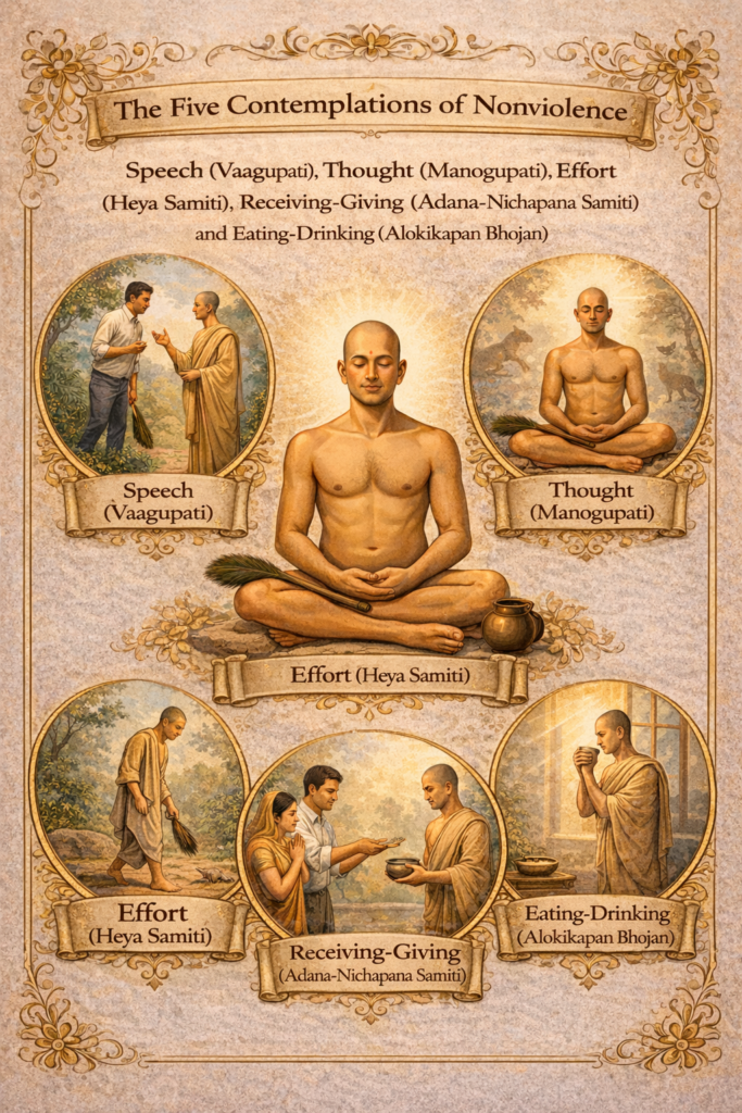 Control of speech – vacanagupti, control of thought- manogupti, regulation of movement – īryāsamiti, care in taking and placing things or objects – ādānanikṣepana- samiti, and examining food and drink – ālokitapāna- bhojana, are the five observances (bhāvanā) for the vow of non-injury (ahimsā). Reference:Tatvartha-Sutra-तत्वार्थ-सूत्र-Vijay-K-Jain