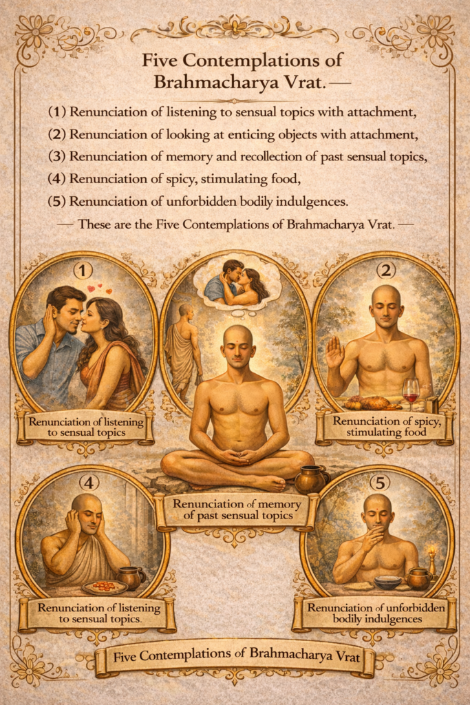 Renunciation (tyāga) of these – listening to stories that incite attachment for women, looking at the beautiful forms of women, recalling former sexual pleasures, delicious food that stimulates amorous desire, and adornment of the body – constitutes the five observances (bhāvanā) for the vow of chastity (brahmacarya). Reference:Tatvartha-Sutra-तत्वार्थ-सूत्र-Vijay-K-Jain