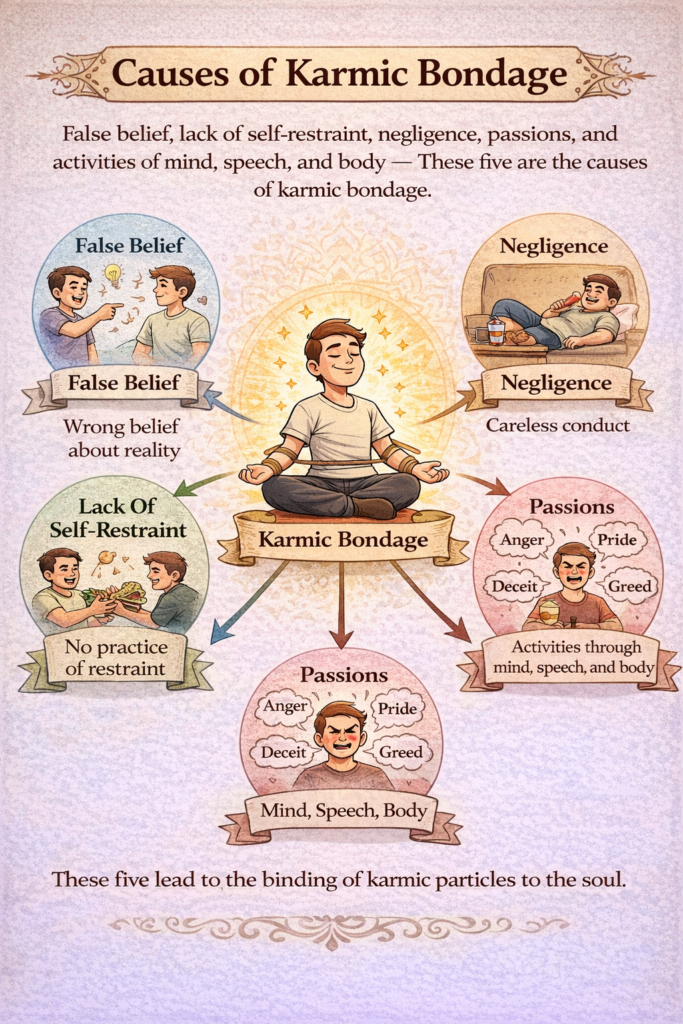 Wrong-belief (mithyādarśana), non-abstinence (avirati), negligence (pramāda), passions (kasāya) and activities (yoga) are the causes of bondage (bandha).