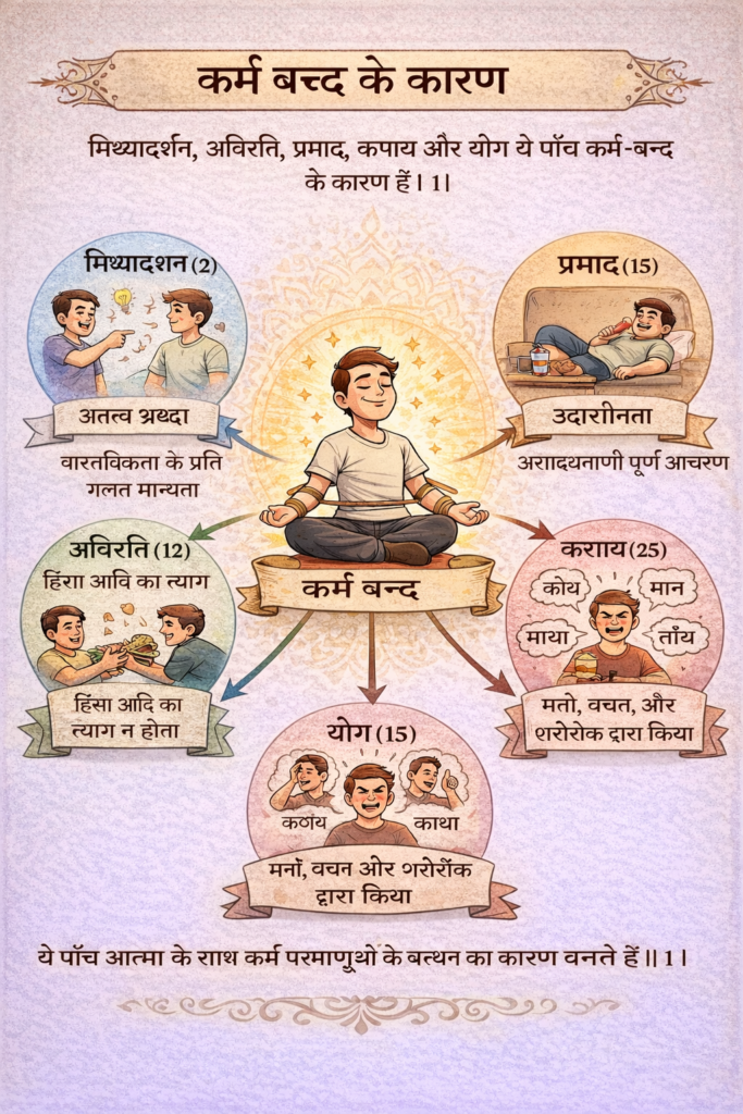 A["बन्ध के कारण"] --> B["मिथ्यादर्शन (2)<br>(अतत्वश्रद्धान)"] & C["अविरति (12)<br>(हिंसा आदि का<br>त्याग न होना)"] & D["प्रमाद (15)<br>(उदासीनता)"] & E["कषाय (25)<br>(आत्मा को कसने वाले)"] & F["योग (15)<br>(आत्मा के प्रदेशों का<br>परिस्पन्द)"]