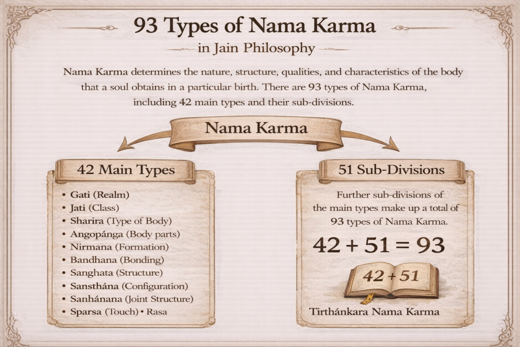 The name or physique-making (nāma) karma has these twenty-one subdivisions: the state of existence – gati, the class – jāti, the body – śarīra, the chief and secondary parts – ańgopāńga, formation – nirmāna, binding – bandhana, molecular interfusion – samghāta, structure – samsthāna, joints – samhanana, touch – sparśa, taste – rasa, odour – gandha, colour – varna, migratory form after death – ānupūrvya, neither heavy nor light – agurulaghu, self-annihilation – upaghāta, annihilation by others – paraghāta, emitting warm light – ātapa, emitting cool light – udyota, respiration – ucchvāsa, gait – vihāyogati. Further, the following ten, with their opposites, constitute twenty additional subdivisions: individual body – pratyeka śarīra – and collective body – sādhārana śarīra, mobile-being – trasa – and immobile- being – sthāvara, good-tempered – subhaga – and bad-tempered – durbhaga, melodious voice – susvara – and unmelodious voice – duhsvara, attractiveness of form – śubha – and unattractiveness of form – aśubha, minute body – sūksma – and gross body – bādara, completion (of the organs) – paryāpti – and incompletion – aparyāpti, firmness – sthira – and infirmness – asthira, lustrous body – ādeya – and lustreless body – anādeya, glory and renown – yaśahkīrti – and obscurity – ayaśahkīrti. The forty-second is the name-karma of Lord Jina – Tīrthakaratva.