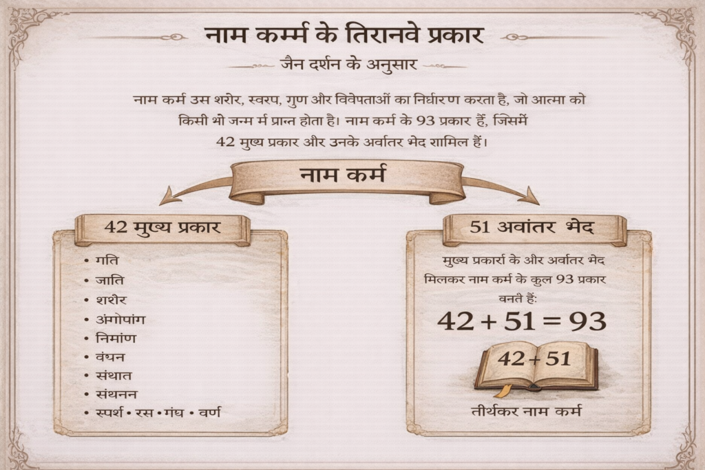 अर्थ : गति, जाति, शरीर, अंगोपांग, निर्माण, बंधन, संघात, संस्थान, संहनन, स्पर्श, रस, गंध, वर्ण, आयुपूर्व, अगुरुलघु, उपघात, परघात, आतप, उद्योत, उच्छवास, विहायोगति, तथा प्रत्येक शरीर, त्रस, सुभग, सुस्वर, शुभ, सूक्ष्म, पर्याप्ती, स्थिर, आदेय, यशःकीर्ती और इन दसो के प्रतिपक्षी अर्थात साधारण शरीर, स्थावर, दुर्भग, दुस्वर, अशुभ, बादर, अपर्याप्ति, अस्थिर, अनादेय और अपयशःकीर्ति तथा तीर्थंकर ये बयालिस भेद में नाम कर्म के हैं। इन्हीं के अवांतर भेदों को मिलाने से नाम कर्म के तिरानवे भेद हो जाते हैं। ॥११॥