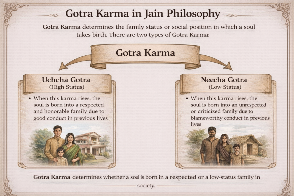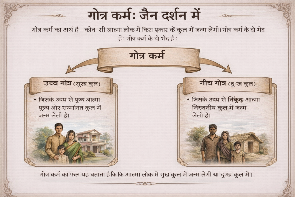 A["गोत्र"] --> B["उच्च<br>* लोक पूजित कुल में जन्म हो"] & C["नीच<br>* निन्दित कुल में जन्म हो"]