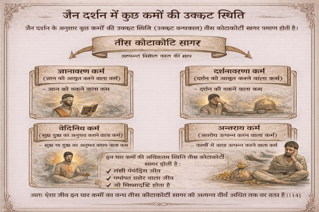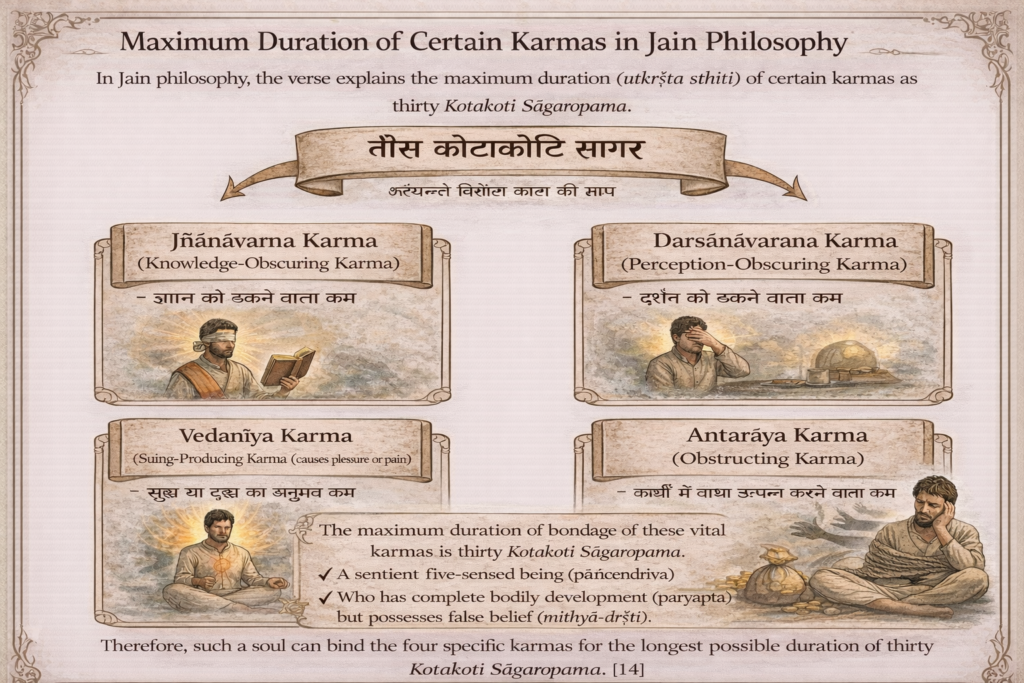 The maximum duration – utkrsta sthiti – of the first three types of karmas, i.e., knowledge-covering (jñānāvarana), perception-covering (darśanāvarana) and feeling- producing (vedanīya), and of the obstructive (antarāya) karma is thirty sāgaropama kotākoti.