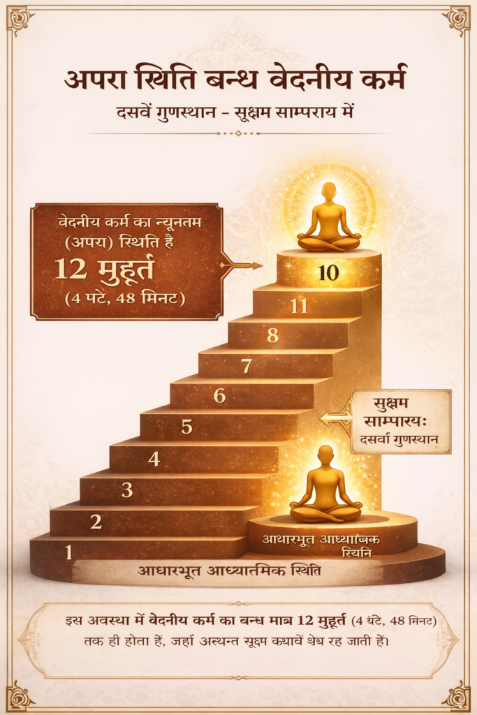 समाधान: वेदनीयकर्म में सातावेदनीयकर्म का जघन्य स्थिति बन्ध बारह मुहूर्त प्रमाण तथा असाता वेदनीय का जघन्य स्थिति-बन्ध पल्योपम के असंख्यातवें भाग कम एक सागर के सात भागों में से तीन भाग प्रमाण होता है।