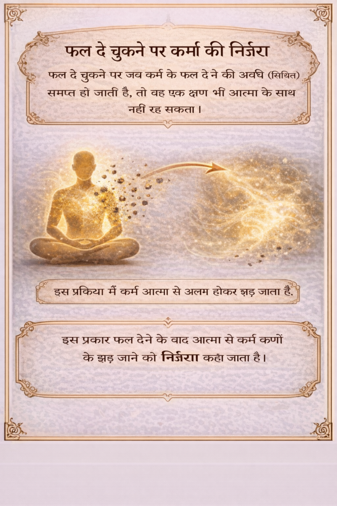 B --> B1["कर्मों की स्थिति पूर्ण होने पर फल देकर झड़ना"]