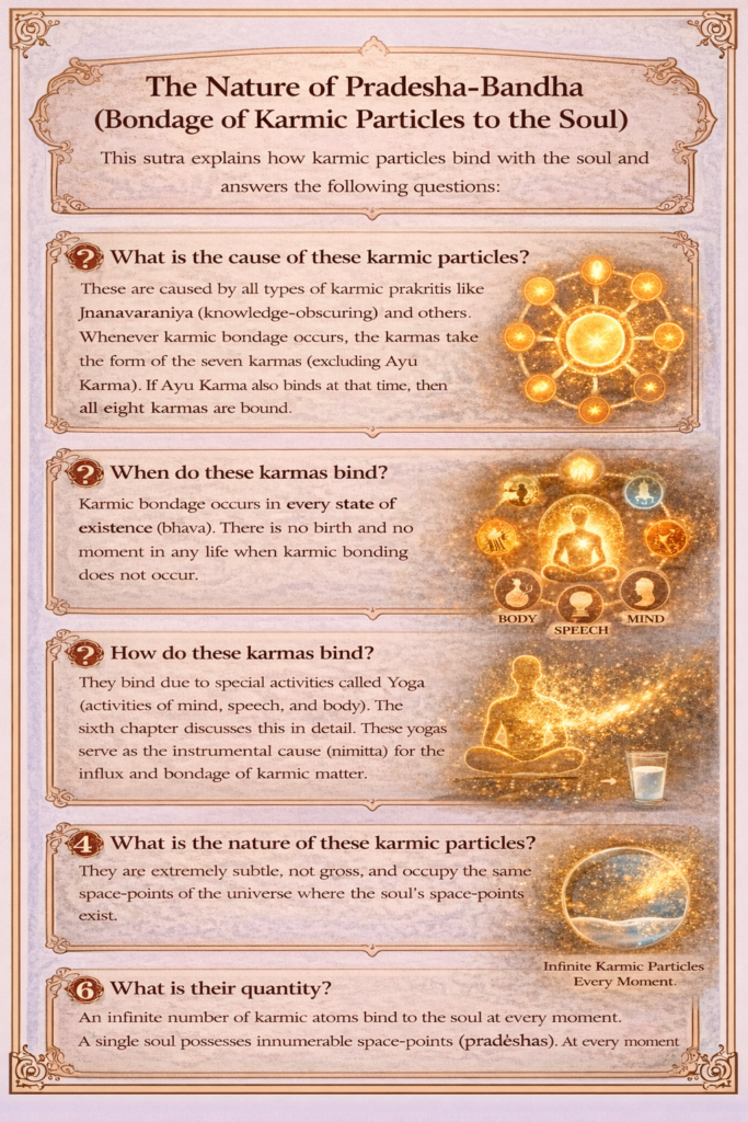 The subtle (sūksma), infinite-times-infinite (anantānanta), stationary (sthitāh) atoms – pudgala paramānu – fit to be transformed into karmas, as indicated by the names of the karmas, pervade the entire space-points (pradeśa) of the individual soul in every birth. And these are absorbed every instant by the soul because of its activity (yoga).