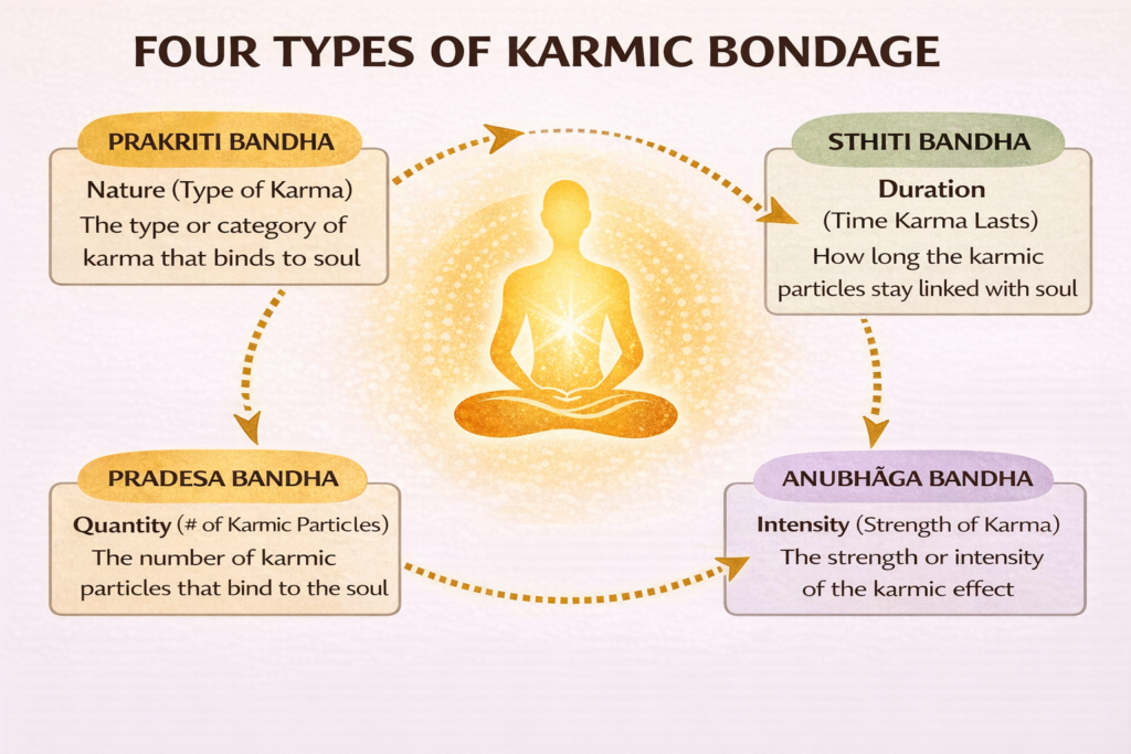 Bondage (bandha) is of four kinds: according to the nature or species – prakrti, duration – sthiti, fruition – anubhava (or anubhāga), and the quantity of space- points – pradeśa.