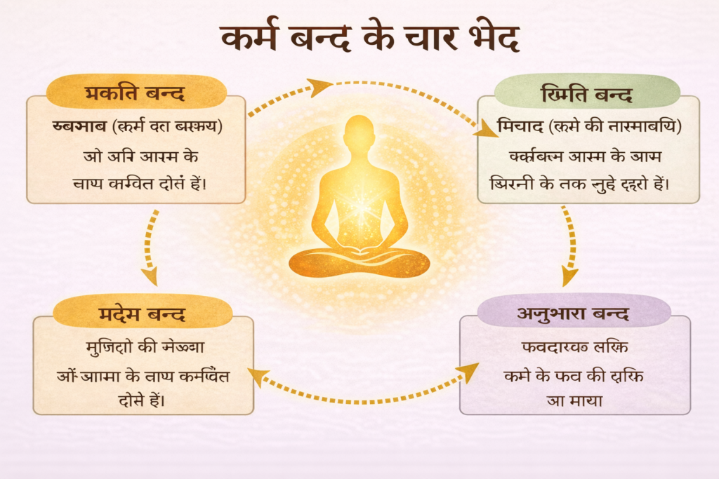 A["बन्ध"] --> B["नाम"] & C["प्रकृति"] & D["प्रदेश"] & E["स्थिति"] & F["अनुभाग"]