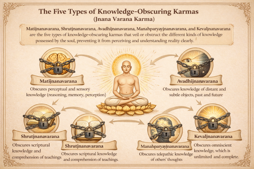 The five kinds of knowledge-covering (jñānāvarana) karma are those which obscure 1) sensory-knowledge (matijñāna), 2) scriptural-knowledge (śrutajñāna), 3) clairvoyance (avadhijñāna), 4) telepathy (manahparyaya- jñāna) and 5) omniscience (kevalajñāna).