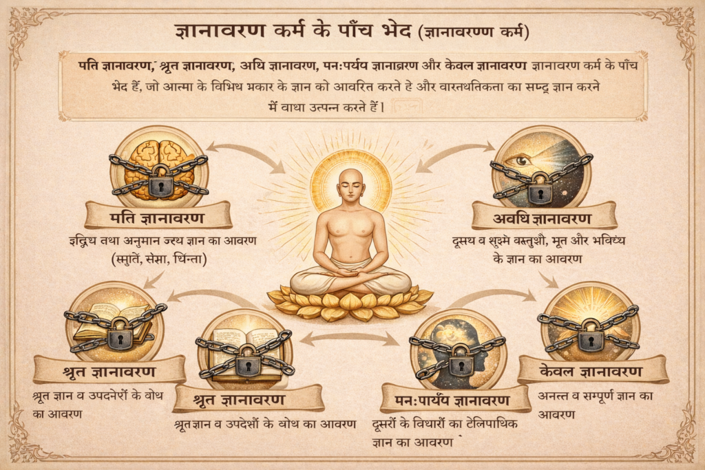 A["ज्ञानावरण"] --> B["5 ज्ञान को आवरण करने वाले 5 भेद"]